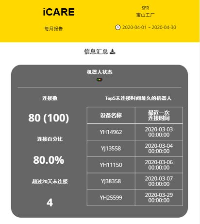 可分開顯示同一區域內多個工廠的數據; 包含機器人數量和上線率。